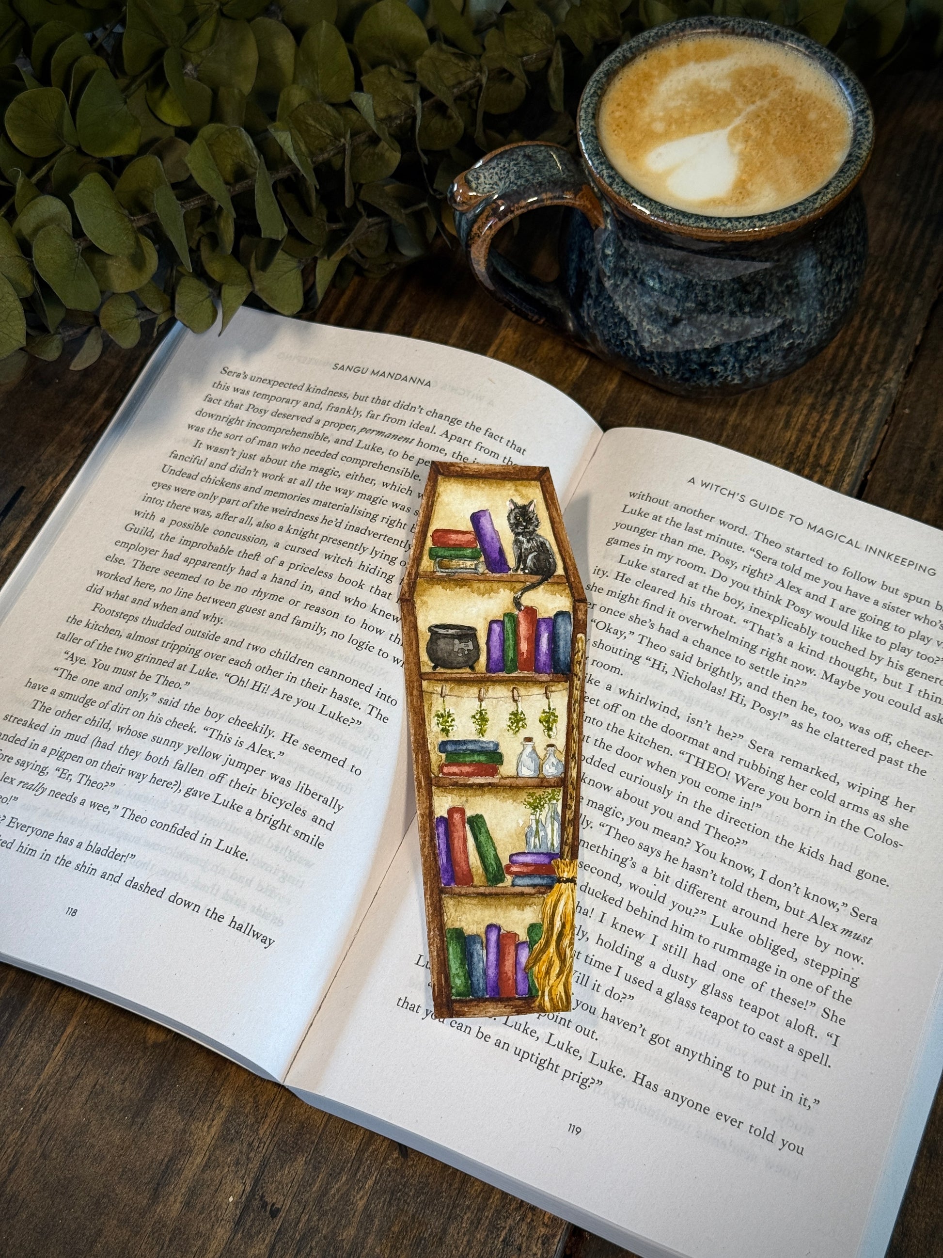 • Design Style: Coffin shaped bookshelf with witchy decor