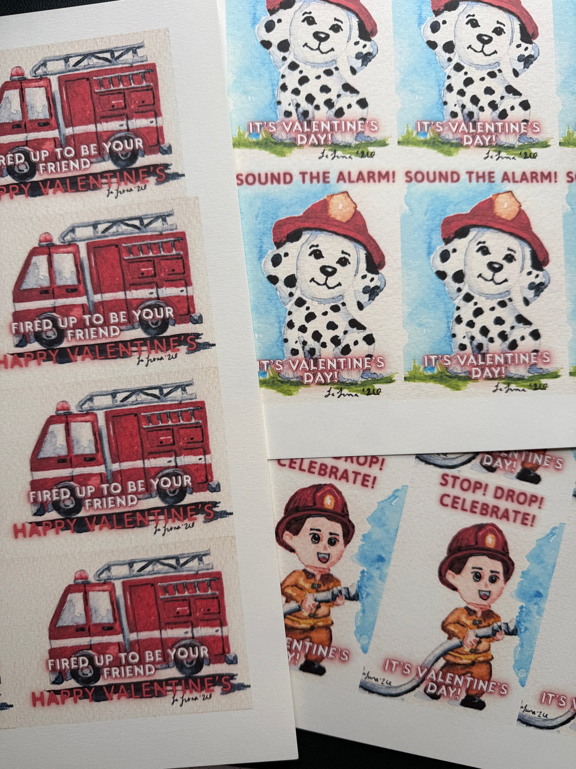 Firefighter theme kids class valentines art prints. This is a physical product, NOT a digital download and created using my original artwork.
