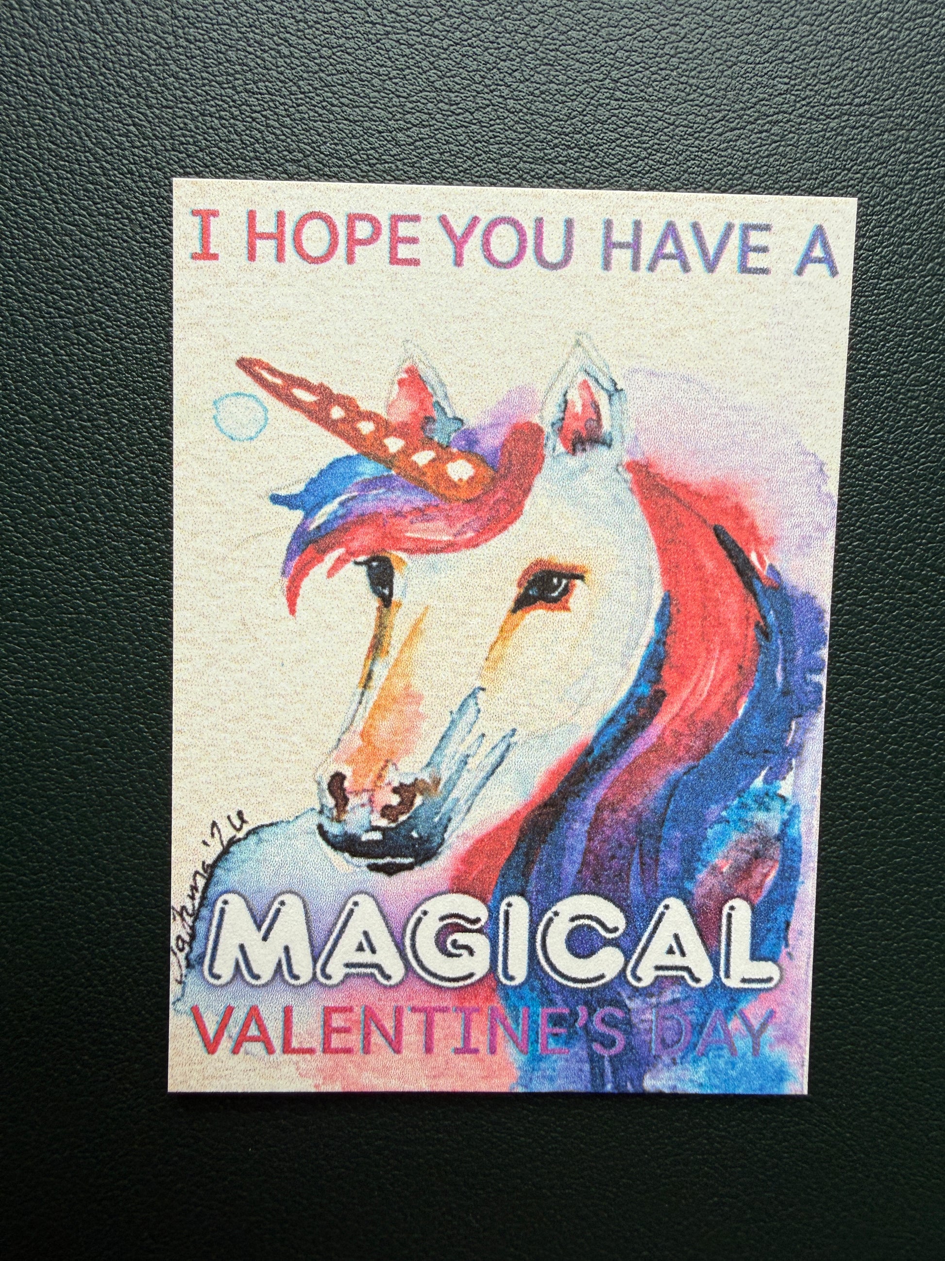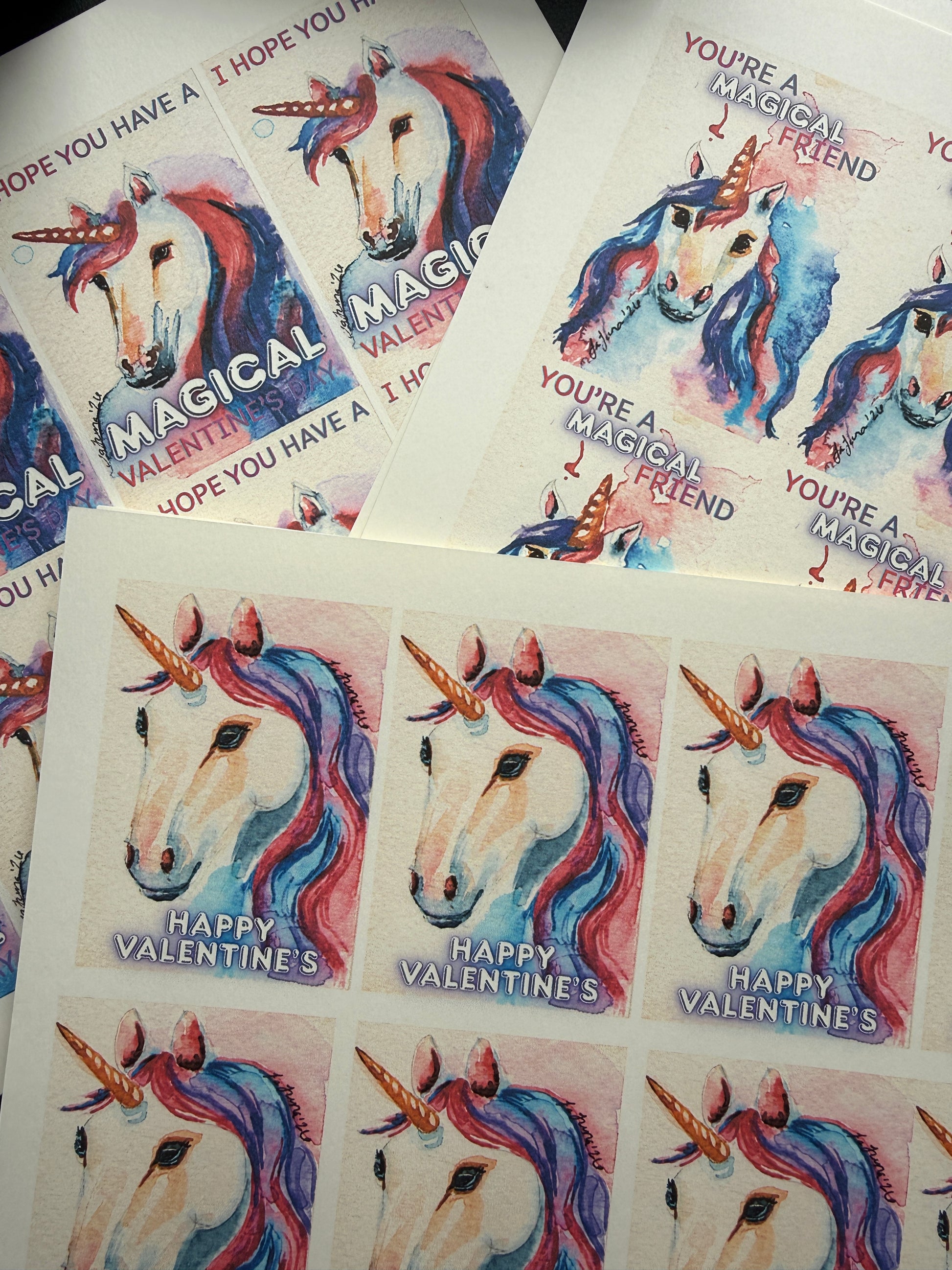 A set of unicorn theme kids class valentine's. This is a physical product and are made from prints of my own original artwork. One set included three images with 4 cards of each image to include 12 cards in total.