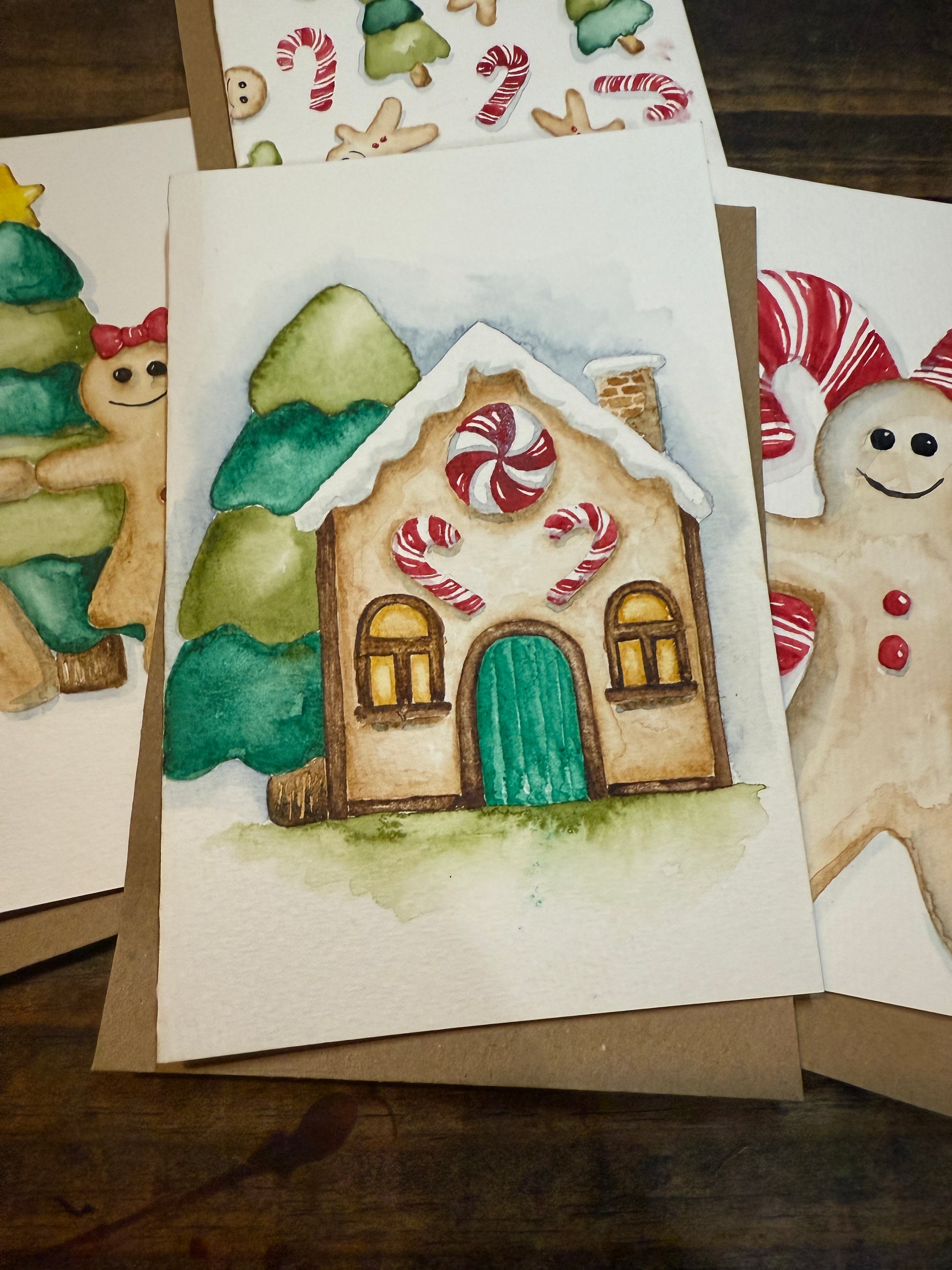 Set of 4 Original, Hand-Painted Gingerbread Christmas Cards. Envelopes included.