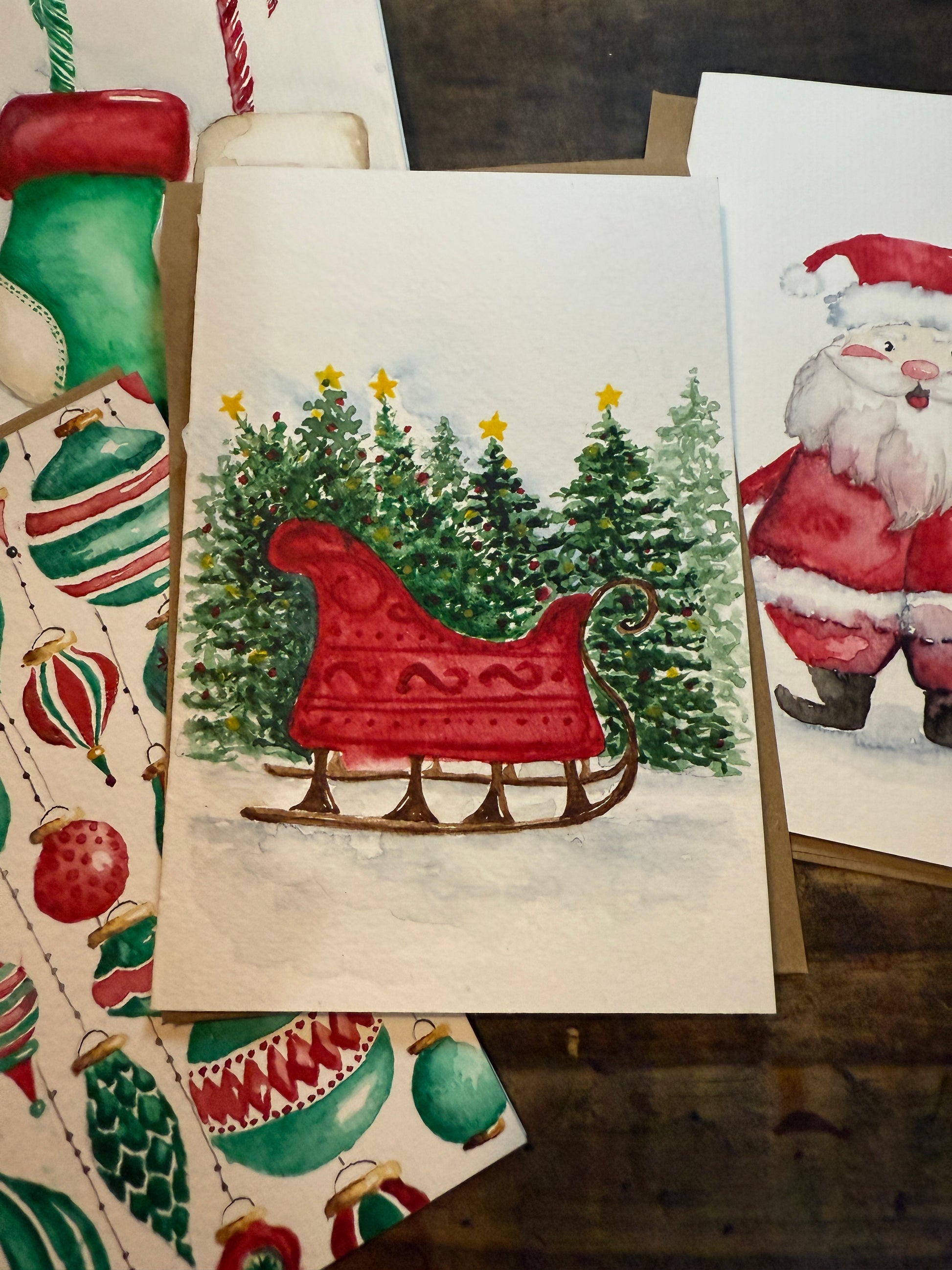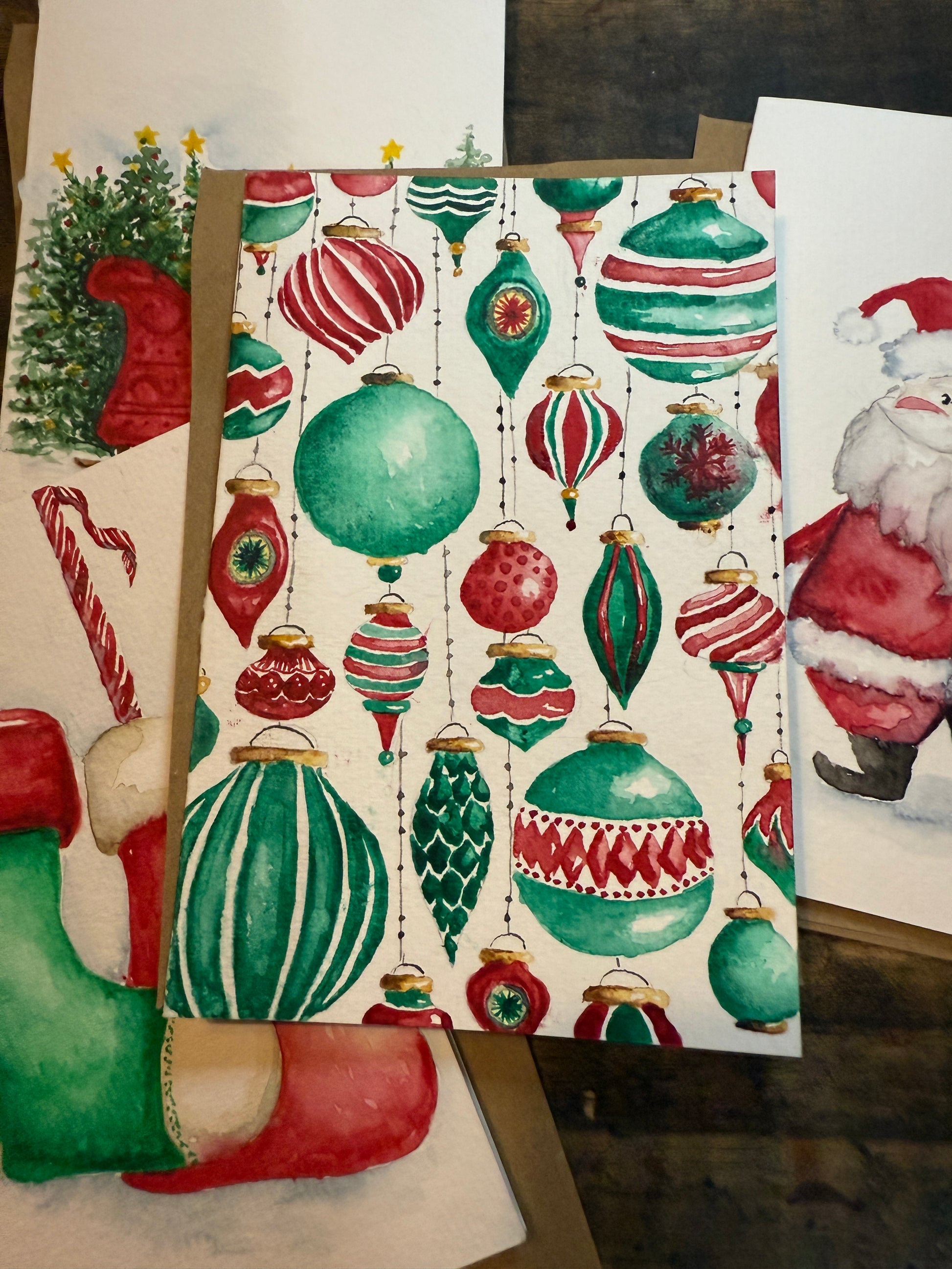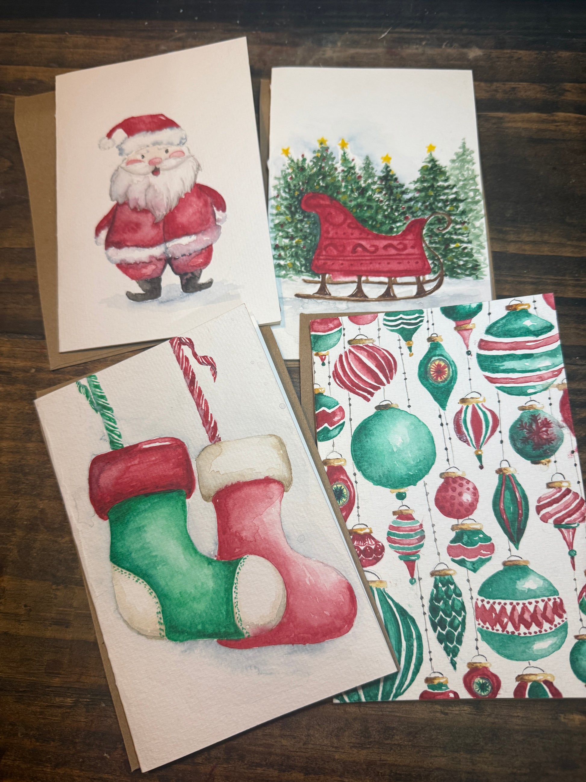 Set of 4 hand-painted, original artwork Christmas Card set. Envelope included.