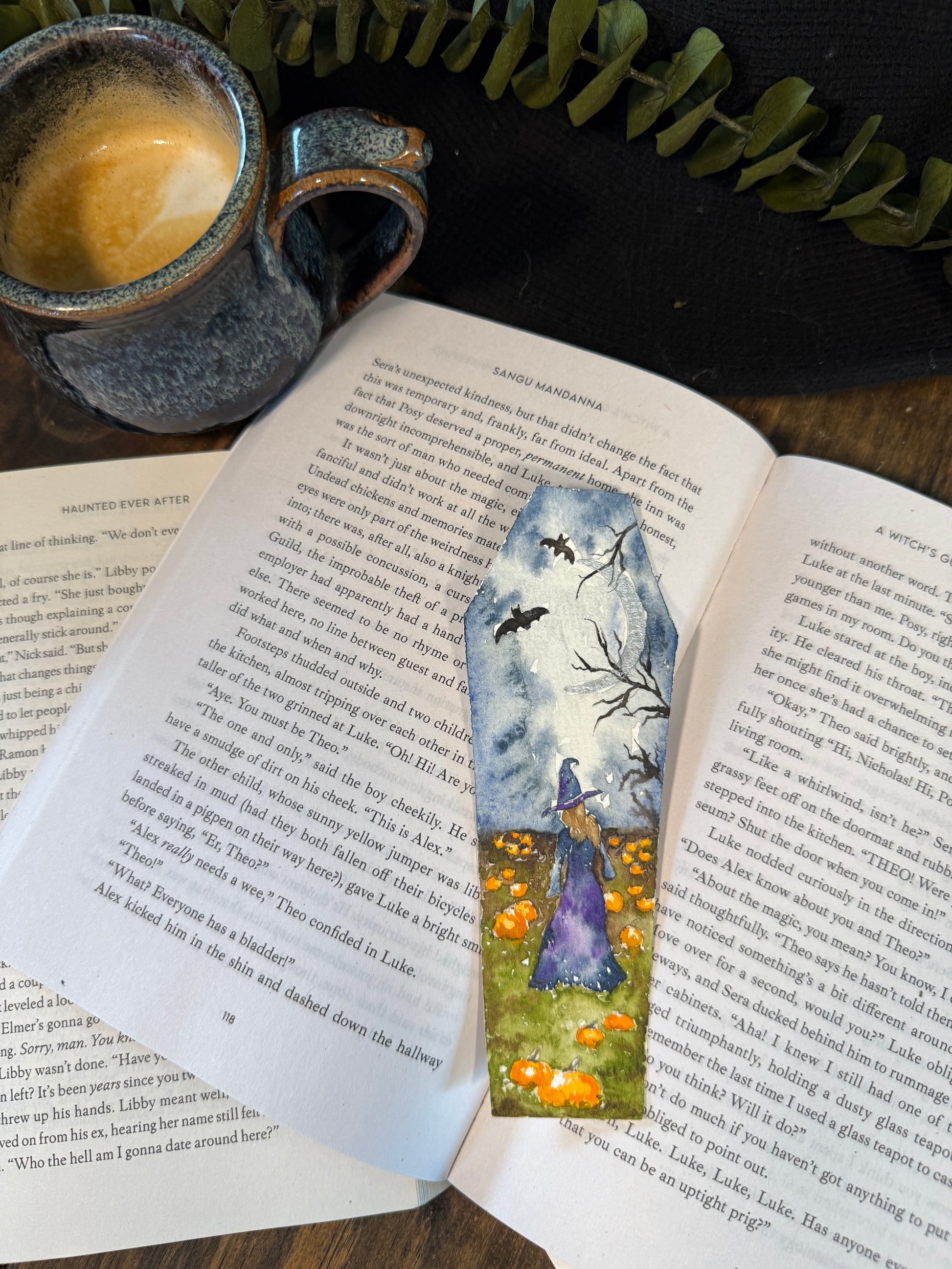 Product Detail: Coffin shape, original hand painted watercolor bookmark painting of a witch walking through a pumpkin patch